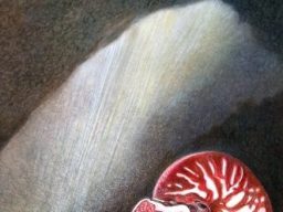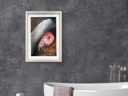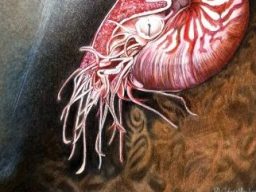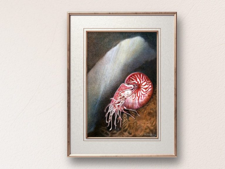 Mit lichtechten Buntstift auf reinem Baumwollpapier gebannt; Ein Nautilus, verborgen in seiner Höhle - blickt zur Decke.